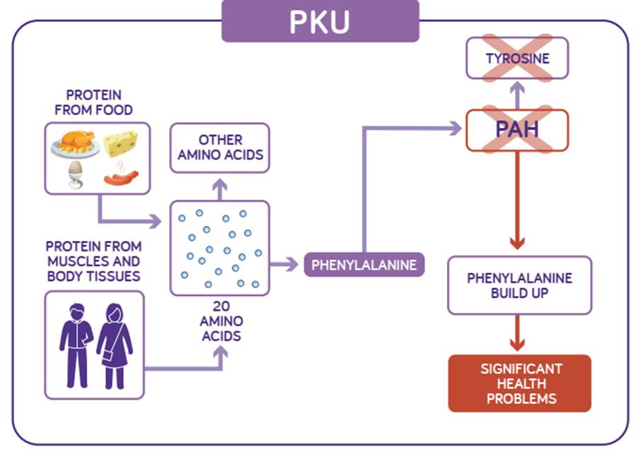 Phenylketonuria (PKU) là một rối loạn di truyền bẩm sinh gây ra bởi sự thiếu hụt enzyme phenylalanine hydroxylase (PAH). PAH giúp cơ thể phân giải axit amin phenylalanine (PHE) thành tyrosine (TYR), một axit amin khác. Trong bệnh PKU, PHE không thể được phân giải trong cơ thể. Tiêu thụ quá nhiều PHE từ thực phẩm có thể dẫn đến sự tích tụ độc hại của PHE trong máu và não của người bệnh PKU.