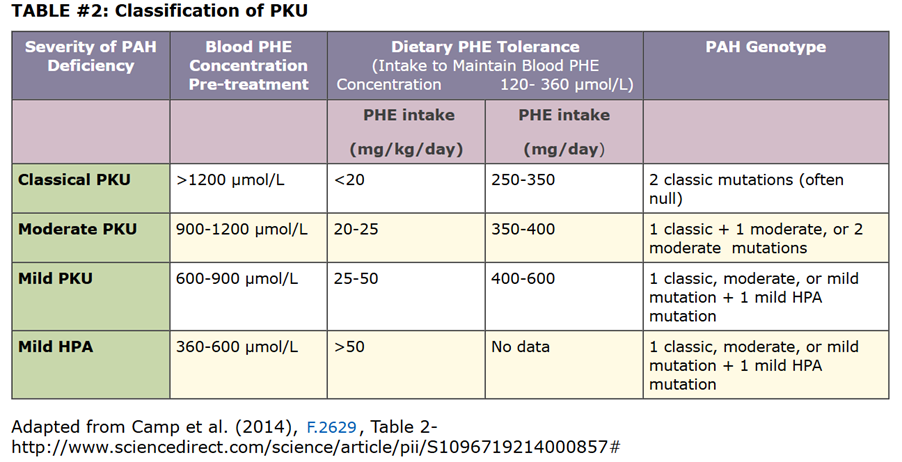 Tùy thể lâm sàng của trẻ PKU mà trẻ dung nạp được mức PHE từ chế độ ăn khác nhau. Trẻ PKU cổ điển có mức ứ PHE rất cao, cần giới hạn nghiêm ngặt PHE từ chế độ ăn (PHE<20mg/kg/d). Trong khi một số trẻ ở thể nhẹ hơn có thể dung nạp được mức PHE >50mg/kg/d.