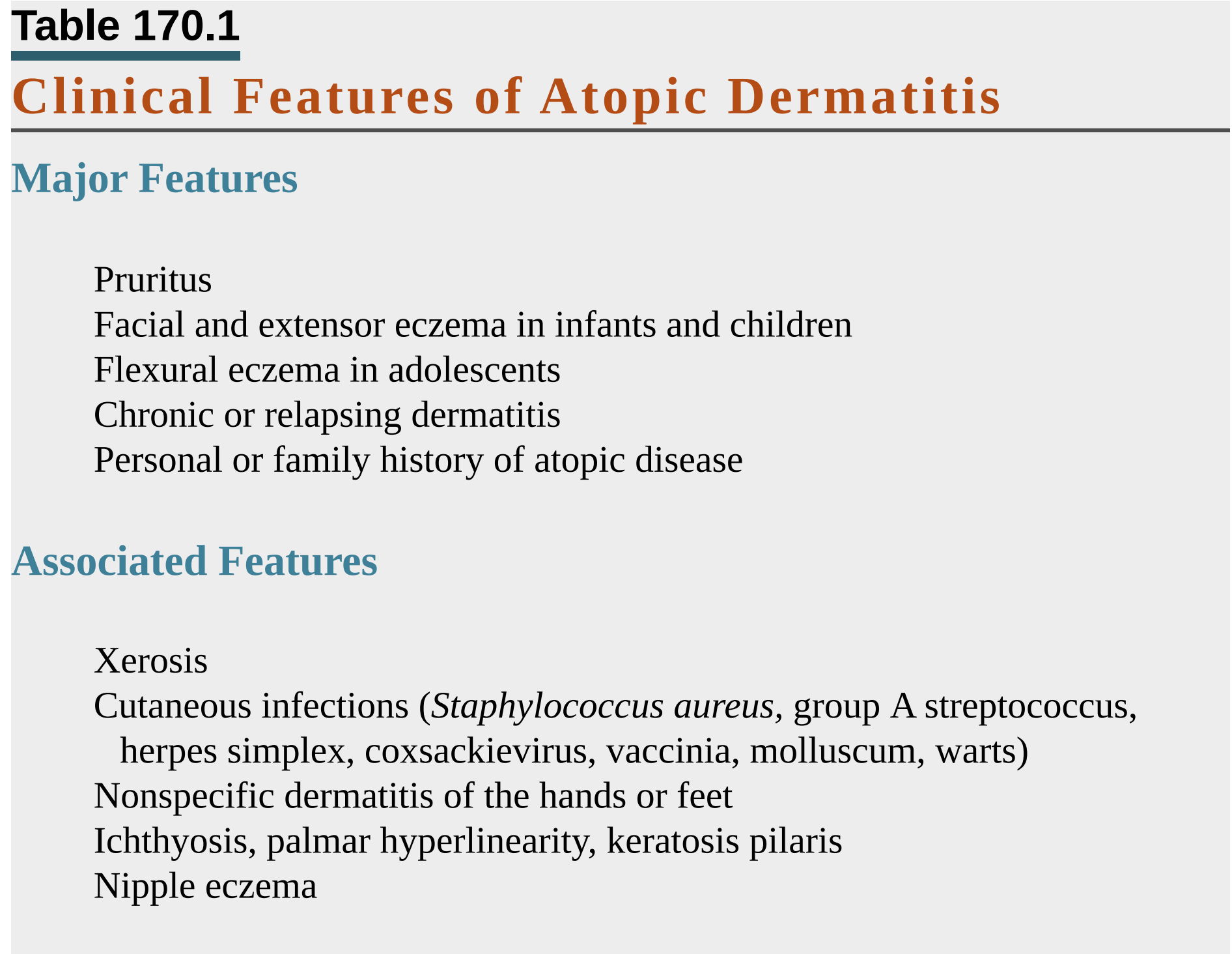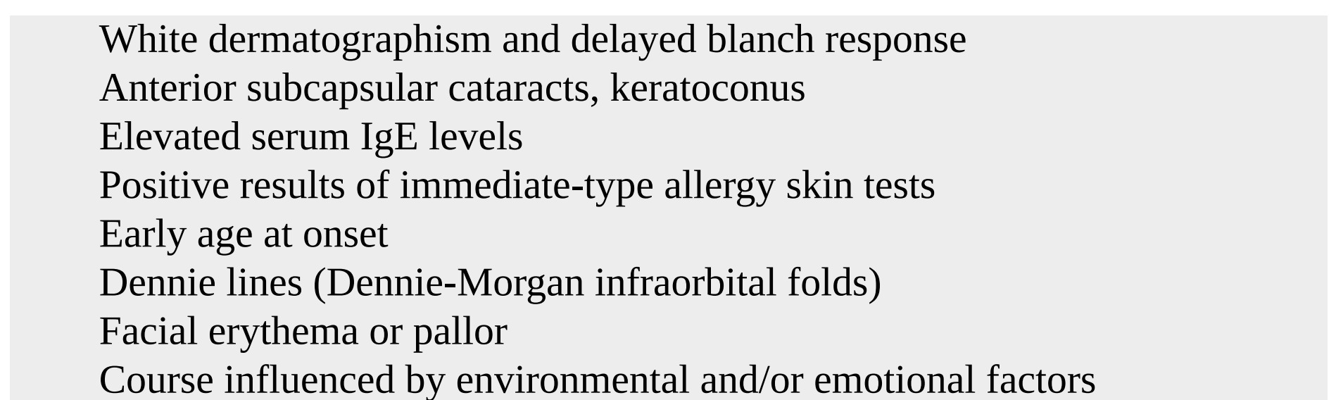 Ngoài ra, có thể có yếu tố liên quan cũng giúp củng cố chẩn đoán: tiền căn gia đình có người bệnh hen, Hay fever, tăng IgE, phản ứng ngay lập tức trên da.