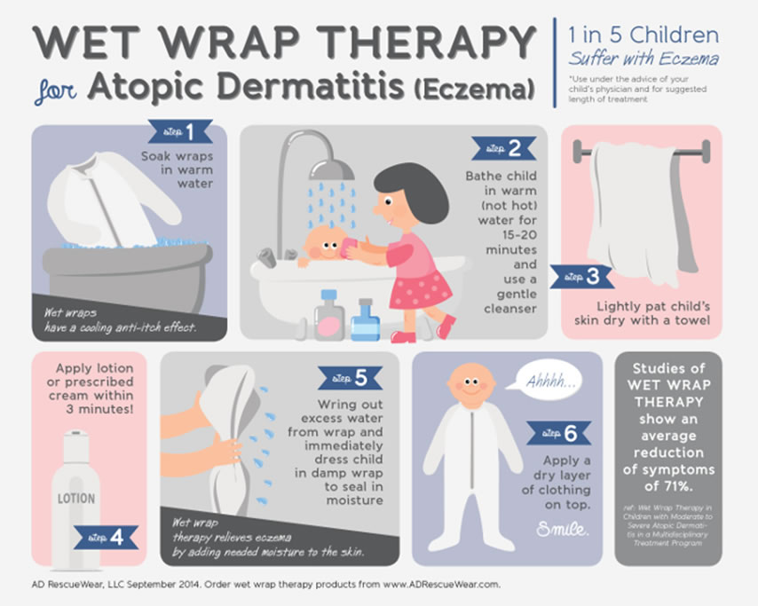 - Đắp vải bông ẩm (Wet dressing): Hướng dẫn như hình dưới đây. Sau khi bôi chất làm mềm, bạn đắp vải bông đã thấm nước vào vùng da tổn thương, ngoài cùng là vải khô hoặc quần áo của bé. Tác dụng Giảm đau (case nặng), Giảm ngứa, Giảm gãi (do ít chạm vào da). Để vài tiếng hoặc qua đêm, nếu làm trong ngày thì thay mỗi vài tiếng.